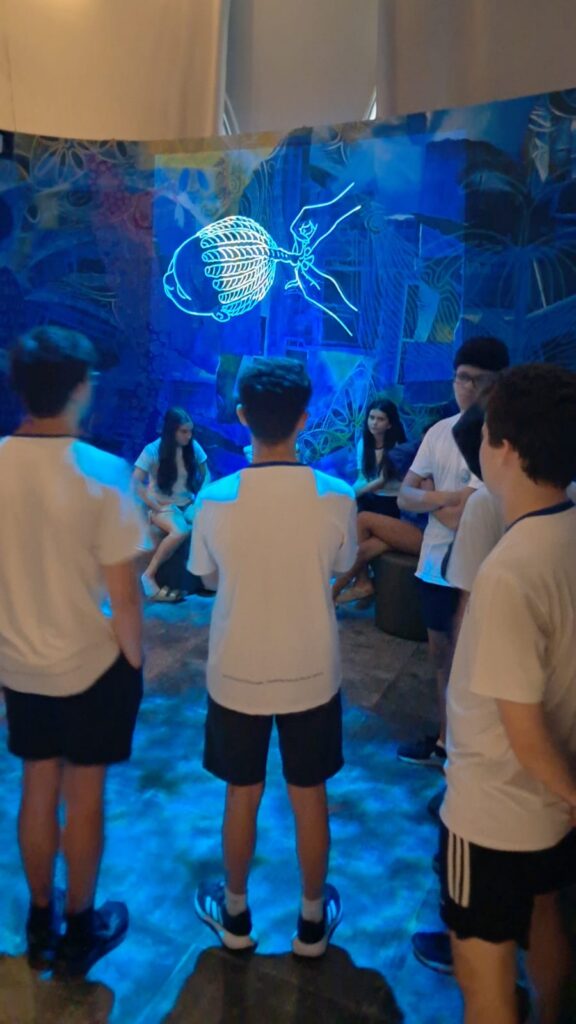 Para Moana, outra importante ação foi formação prévia de educadores que participaram em live prévia à exposição com o Núcleo de Educação, momento em que foram apresentadas informações sobre a exposição e roteiros pedagógicos, elementos que fortaleceram a confiança das escolas para o agendamento. Ela destaca o crescimento expressivo de atendimentos inclusivos, com diversos grupos que informaram, previamente, a presença de estudantes com transtorno do espectro autista, síndrome de Down e deficiência visual, reforçando a importância da preparação da equipe e do planejamento pedagógico individualizado.