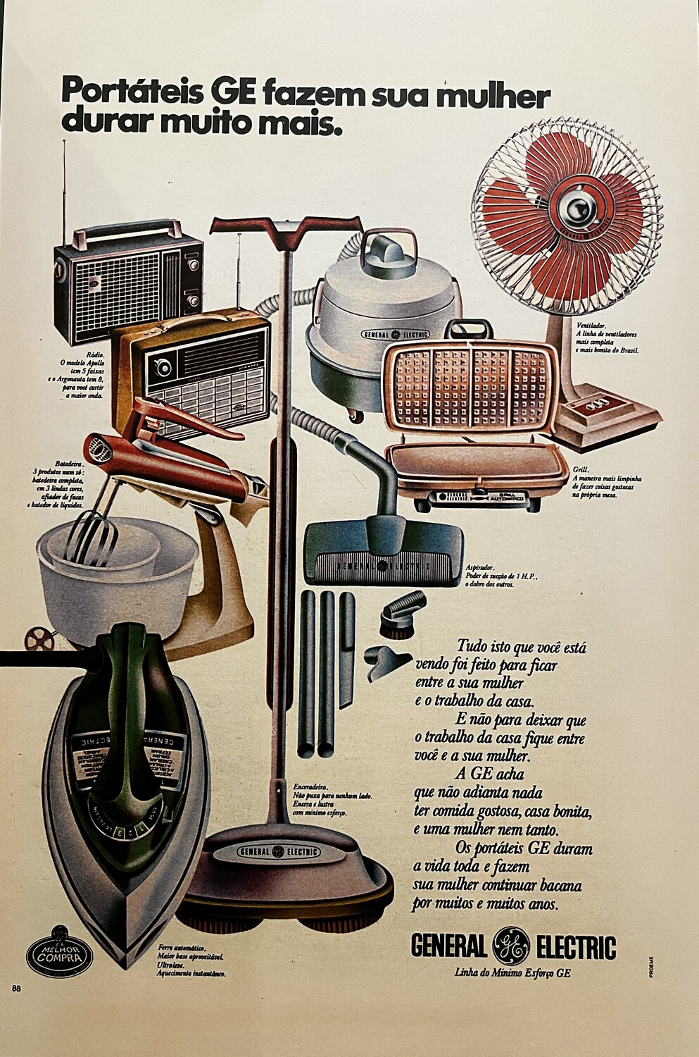 A imagem traz um anúncio com o título “Portáteis GE fazem sua mulher durar muito mais”, de 1974, que endossa o lugar da mulher como…