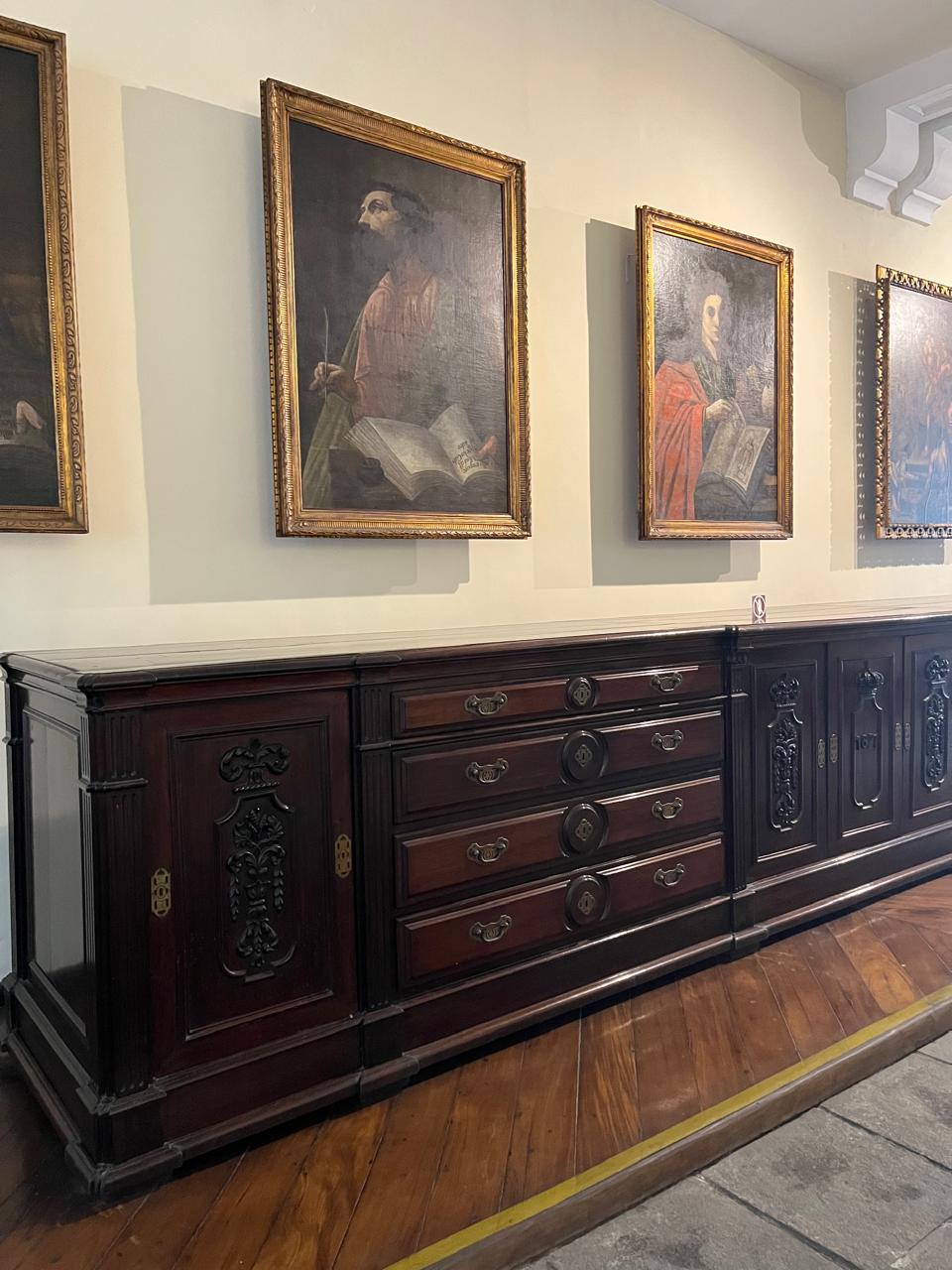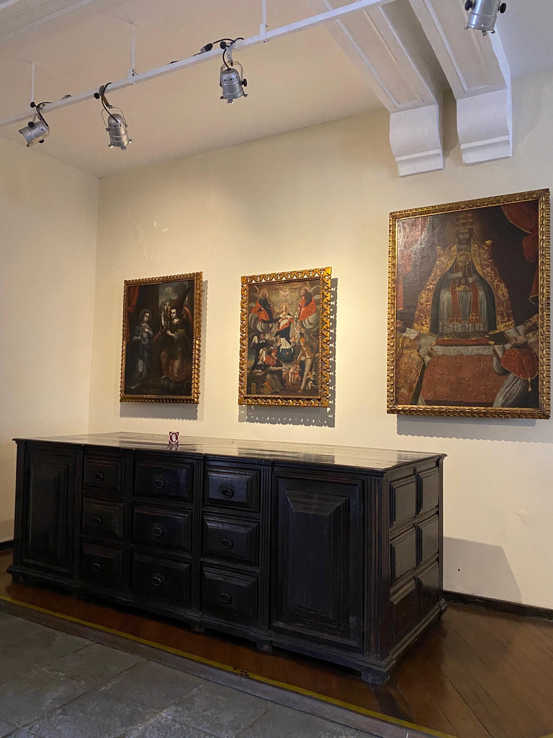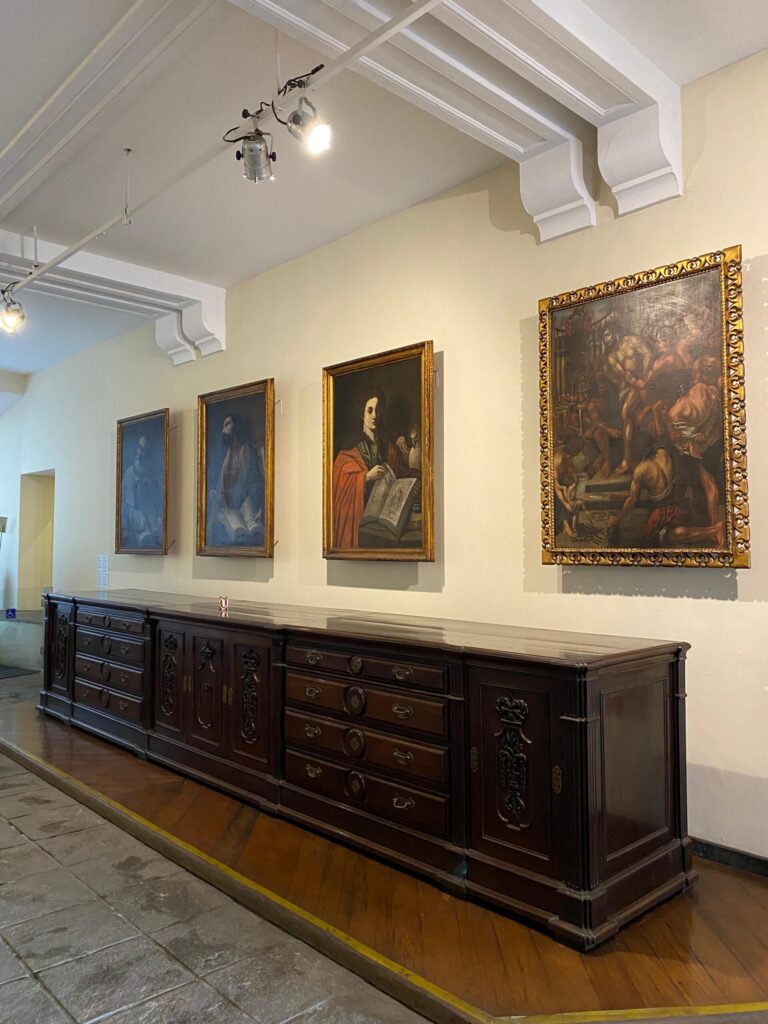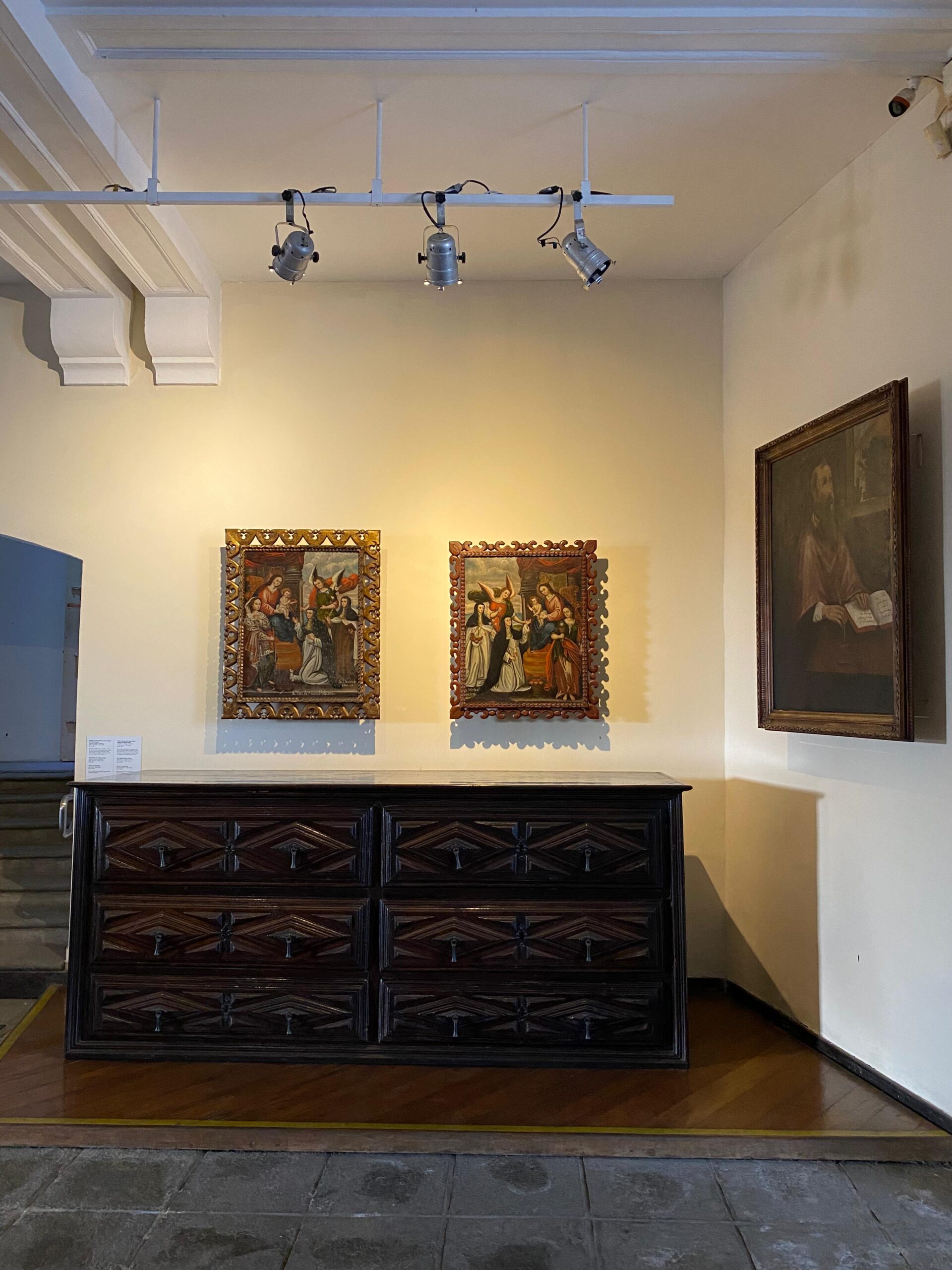 As peças apresentadas no “Hall dos arcazes”, no térreo do Museu HISTÓRICO Nacional, são pinturas coloniais religiosas cusquenhas que se somam aos arcazes, móveis característicos de sacristias, do mesmo período, usados para guardar os paramentos das igrejas.